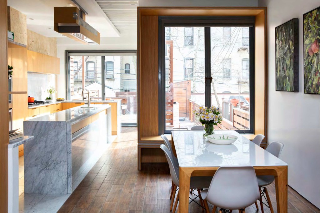 A contemporary kitchen, dining room and living room renovation remodeling featuring open concept.